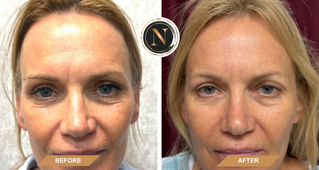 This before and after highlights a 59-year-old female from North Alabama, 6 weeks post-op from a brow lift and upper blepharoplasty. The combined procedure, lasting under 2 hours with a 7–10 day recovery period, achieved a smoother, lifted appearance with natural rejuvenation of the eye and brow area.